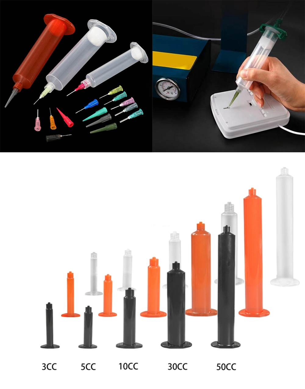 المحقنة الشفافة مناسبة لجميع أنواع غراء التغليف الإلكتروني، والغراء الموصل، ومواد الصهر، والغراء الأحمر لرقعة SMT، وزيوت التشحيم، والطلاء، وغيرها. اللون الأسود مناسب لغراء الأشعة فوق البنفسجية، وغراء المعالجة بالضوء، والحالات التي تتطلب تظليلًا أسود. اللون الكهرماني مناسب للاستخدام العام في أماكن العمل التي تتطلب حماية من الأشعة فوق البنفسجية، ولا يُنصح بتخزين غراء الأشعة فوق البنفسجية لفترة طويلة. المادة: بولي بروبيلين.